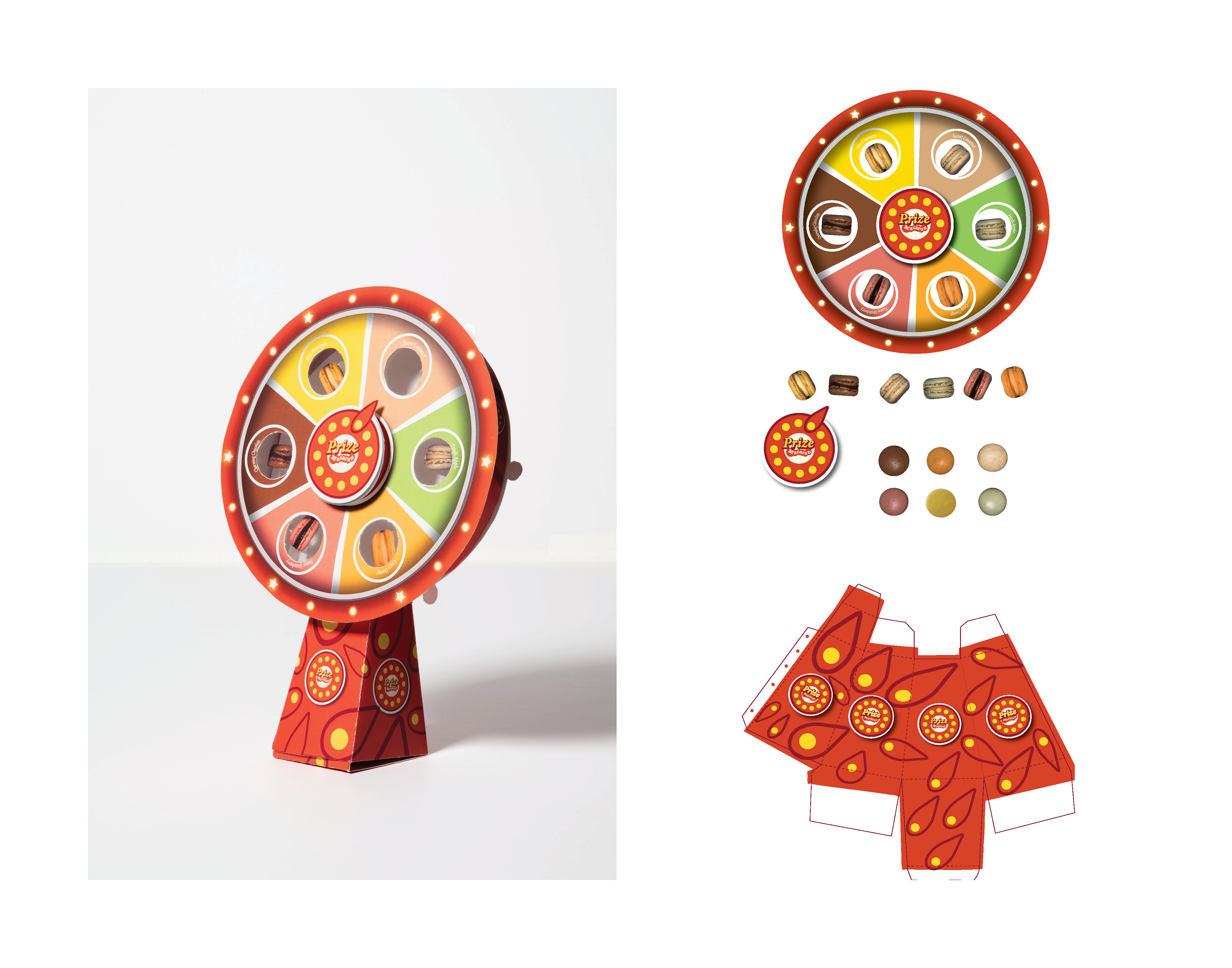 A confection package design featuring a prize wheel illustration for a fun and varied look. Bright colors and playful fonts suggest excitement and tasty flavors, creating a memorable brand identity.